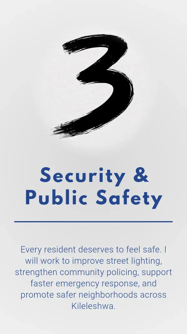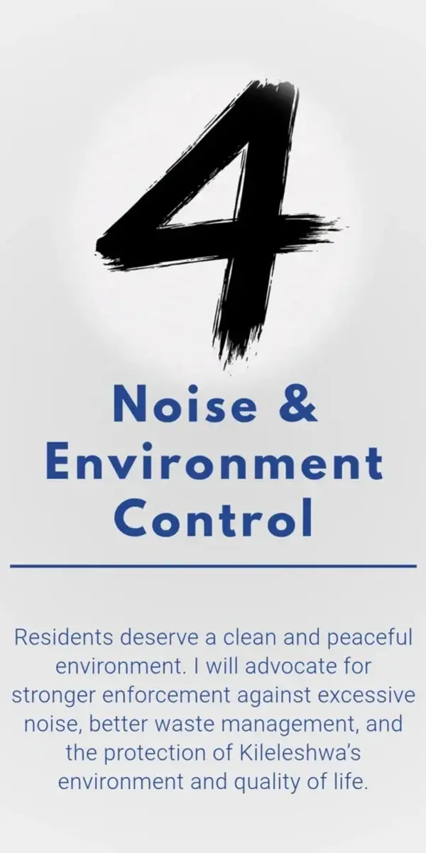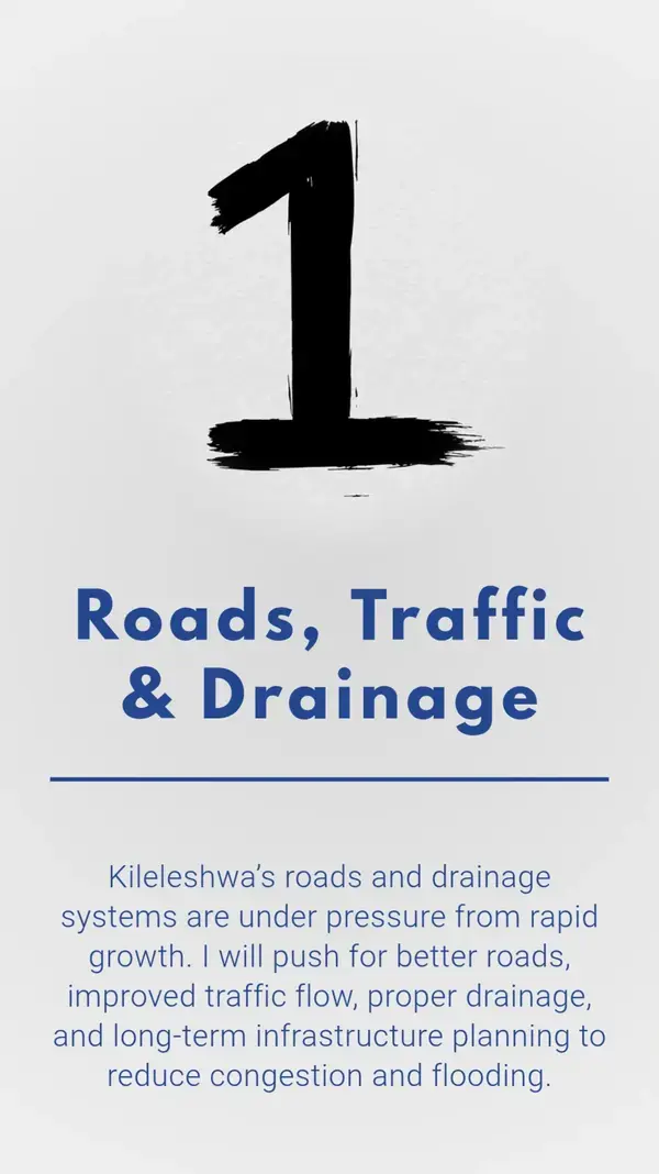 I believe Kileleshwa should have safer roads, better traffic management, reliable drainage systems, and stronger infrastructure that can support a growing population. I am committed to addressing flooding, congestion, and the strain caused by uncontrolled development. Through stronger zoning enforcement and oversight, I will push for development that matches the ward’s infrastructure capacity and protects the character of Kileleshwa.