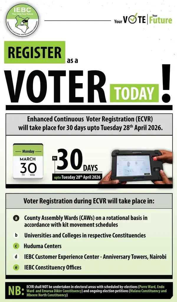 The IEBC has launched the Enhanced Continuous Voter Registration (ECVR) exercise nationwide from 30th March to 28th April 2026.