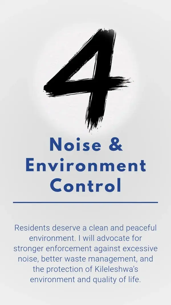 I am vying for MCA because I believe Kileleshwa deserves leadership that listens, acts, and delivers results. My vision is to create a well-planned, secure, clean, and resident-driven ward where development is properly managed, roads and drainage are improved, businesses can thrive, and every resident has a voice in decision-making.