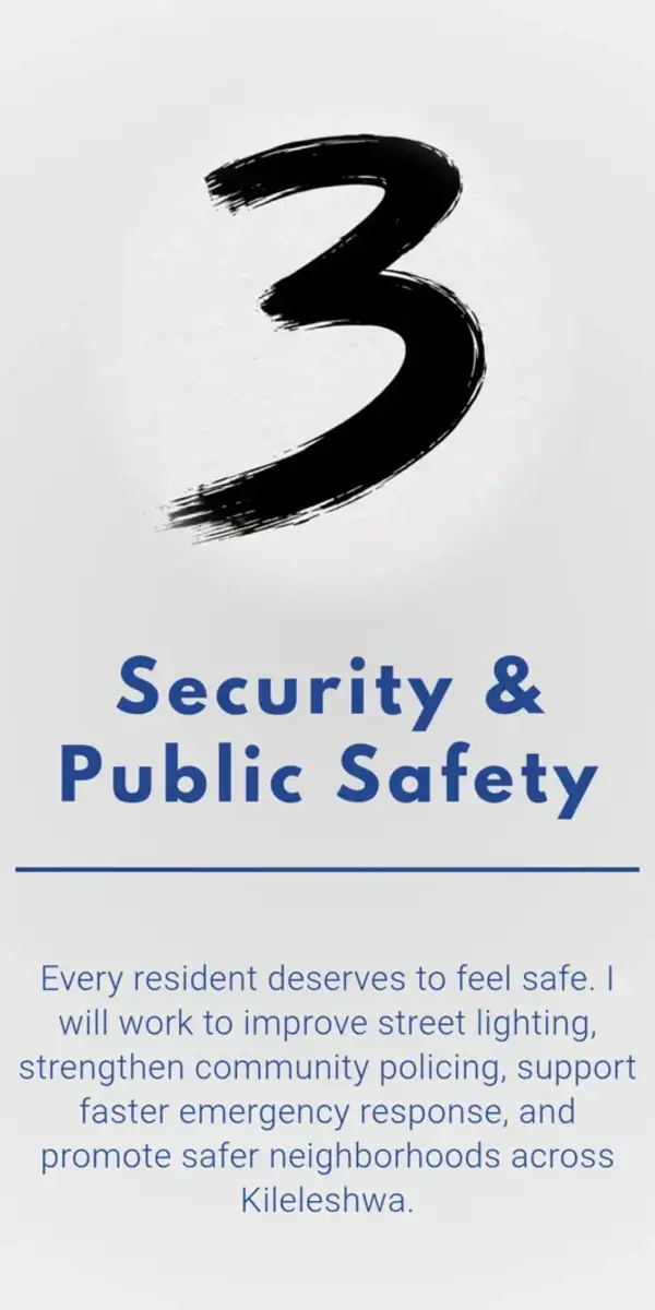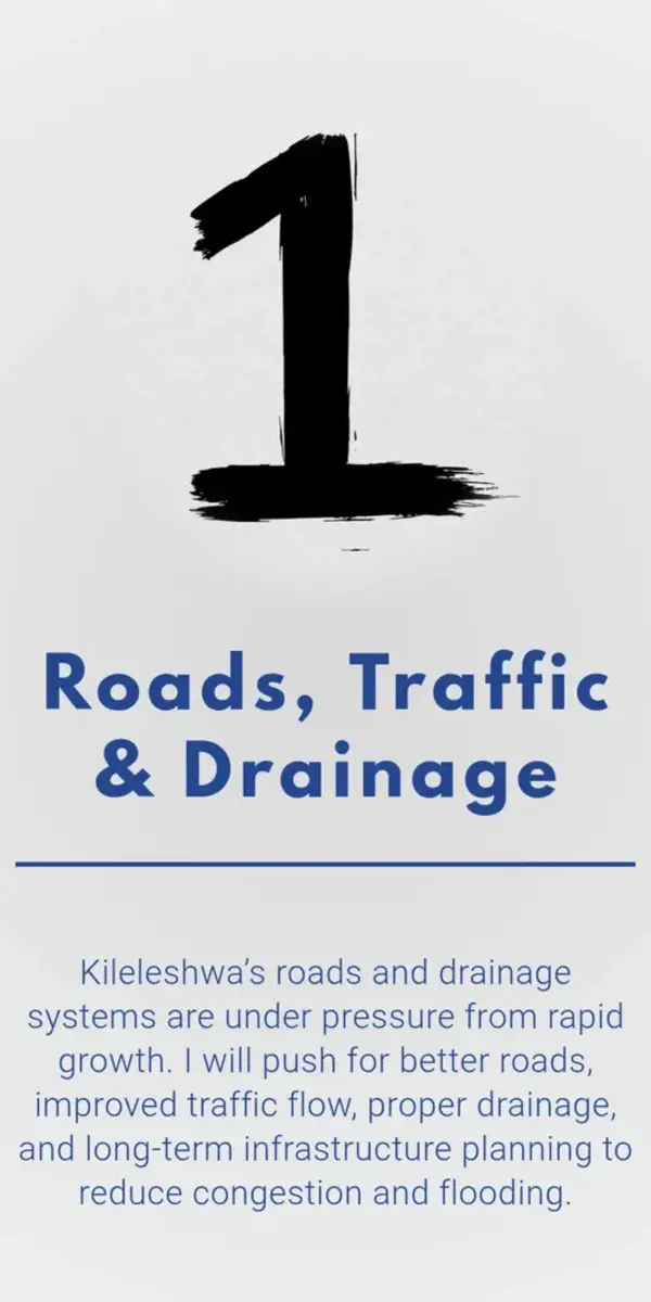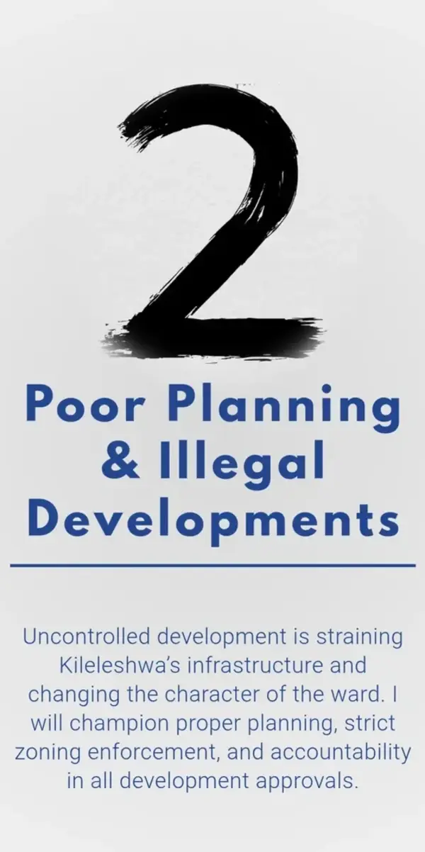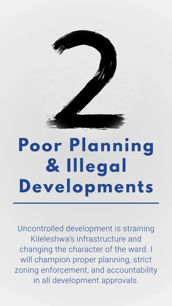 I believe Kileleshwa should have safer roads, better traffic management, reliable drainage systems, and stronger infrastructure that can support a growing population. I am committed to addressing flooding, congestion, and the strain caused by uncontrolled development. Through stronger zoning enforcement and oversight, I will push for development that matches the ward’s infrastructure capacity and protects the character of Kileleshwa.